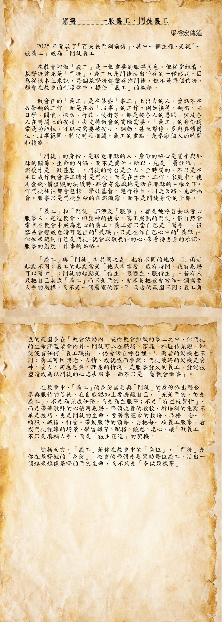 翻開聖經,我們就看見許多總動員的畫面,如以色列人離開埃及事奉神。在出埃及記19:1-96中,神所選的祭司乃指整體以色列人,尼希米修築城牆(尼希米記4:15-20),主耶穌差遣七十人傳道(路加福音10:1-3)等,在舊約時代神期待全體選民事奉衪,為衪作見證,在新約中,主耶穌亦期待每一位信徒事奉衪,在萬民中為祂作見證。